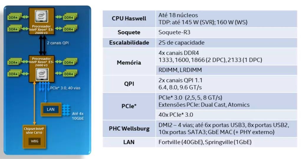 Abaixo apresentamos um resumo dos recursos, dispostos em socket LGA2011-V3. Destacamos o incremento na quantidade de núcleos, chegando à 18 núcleos físicos por processador, ou 36 threads devido à tecnologia Intel Hyper Threading com TDP de 145W, novo patamar de cache, chegando à 45MB e suporte à memórias DDR4 RDIMM e/ou LRDIMM. Tecnologia QPI permanece agora com velocidades até 9.6 GT/s, suporte total à PCI Express 3.0, maior quantidade de portas SATA3 6.0Gbps, a chegada do USB 3.0 e novas opções de conectividade de rede.